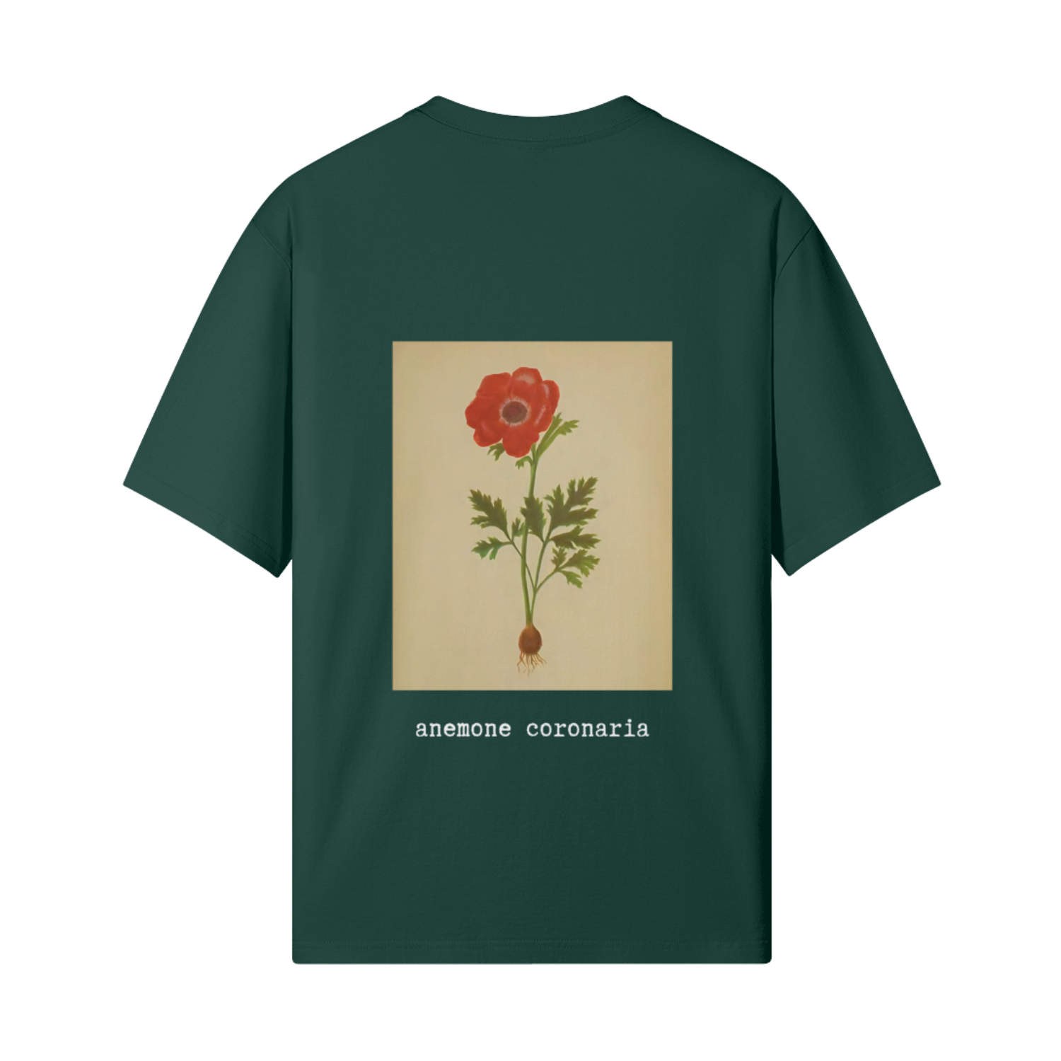 The back of the t-shirt features a historical botanical illustration of the poppy. Below the graphic is the Latin name of the species.